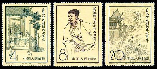 1958年6月20国家邮电部发行的纪念《关汉卿戏剧创作七百年》邮票一套3枚;苏联于1958年发行的纪念关汉卿邮票