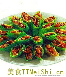 7)抹上一层鸡蛋糊,撤上香菜、蛋糕末,入笼蒸2分钟取出;