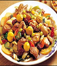 2)将鸡肉下旺油锅中,炸呈金黄色捞出,改刀装盘;
