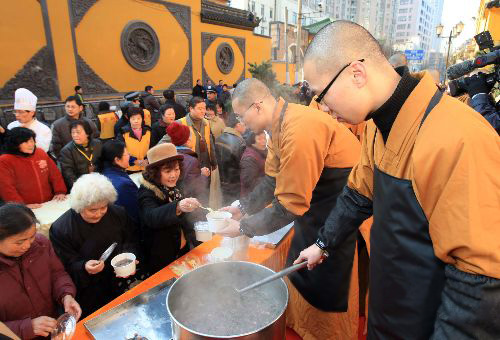 相传农历十二月初八是佛祖释迦牟尼的成道日,佛寺院一般都要在这一天举行诵经,并且效法佛成道前牧女献乳糜的传说故事,取各种香谷及果实等做成粥,供佛教徒和来祭拜的人们食用。