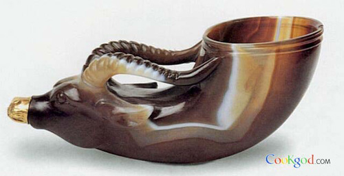 该觥造型应仿自犀角觥,然而它又大胆地突破了旧的艺术框架,成功地在角形觥体上雕出了神形俱佳的牛头,使人隐约感到这件酒觥似乎就是牛角所制。巧妙运用了玛瑙的本色和斑纹,使之与牛的毛色花斑正相吻合,巧夺天工,堪称一绝!