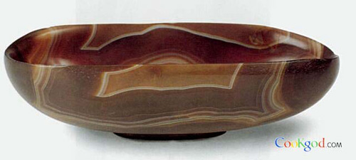 羽觞1970年10月出土于陕西省西安市何家庄的唐代器物窖藏坑中,呈椭圆形,似耳杯而又无双耳,小平底。酱红色玛瑙,有多种不同颜色且不太规则的瑕斑。雕刻者利用了玛瑙本身颜色不同的自然花纹,琢磨精细,艳丽夺目,是唐代少有的艺术珍品。