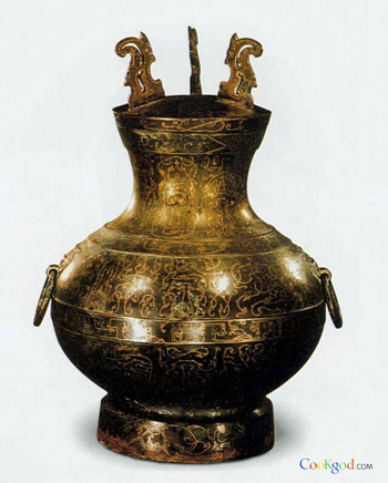 系上海博物馆珍藏的一件精美的青铜酒器。侈口,束颈,鼓腹,圈足,腹两侧置铺首衔环。口部边沿、肩部、腹中部及圈足各饰一周错金银几何纹、云纹以及龙、虎等动物纹。颈、腹上下各有一周错金银鸟篆文,共二十九字,内容为祈求生活美好、延年益寿的吉祥语。其形制、纹饰、铭文及制作工艺,均与刘胜墓出土的错金银铭文铜壶相似,制作亦极为精美。高34.7厘米。