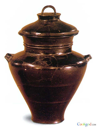 此酒器1974年出土于山东省胶州市三里河遗址,细泥黑陶,外表打磨光滑,乌黑黝亮,侈口,高直颈,圆肩,深腹,腹壁较斜直,肩部附有对称的两耳和两盲鼻,颈部和腹部有弦纹,器盖呈覆碗形,上部有环形把手。