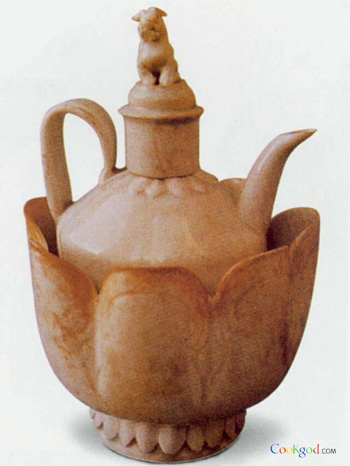 此温碗注子1963年于安徽宿松洛土村北宋墓出土,由温碗和酒注子配套组成。温碗为高圈足深腹莲花形,各莲瓣间的边沿连以刻划的缠枝花卉,圈足外环贴覆瓣莲花。酒注置于温碗中,为与温碗相配合,酒注通体也作六瓣瓜棱形。直口广肩,口部套以筒形盖,盖顶塑一蹲狮。瓶颈下饰贴花覆莲纹一周,肩部微折,高度约与碗口平齐,流柄对称,位于肩的上部。注与碗的上下组合和整个花纹图案设计,协调完美,胎质细腻,釉色明澈温润,青素淡雅,是一套精美的生活用器。
