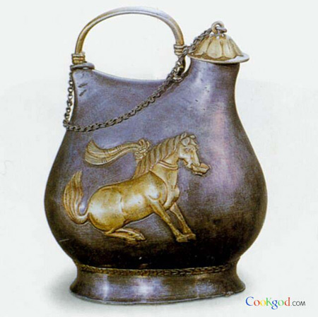 此银壶1970年自西安市南郊何家庄的唐代金银器窖藏坑出土,扁圆腹,莲瓣纹壶盖,弓形提梁,一条细链连结着壶盖与提梁。壶底与圈足相接处有“同心结”图案一周,系模仿皮囊上的皮条结。圈足内墨书“十三两半”,是壶的重量。壶腹两侧用模具冲压舞马图,马肥臀体健,长鬃披垂,颈系花结,绶带飘逸。只见它口衔酒杯,前腿斜撑,后腿蹲曲,马尾上摆,好像正合着音乐节拍,以优美的舞蹈为饮酒者伴饮助兴。马身和提梁、壶盖及“同心结”纹带均鎏金,使得银壶富丽堂皇,明快悦目。该壶构思巧妙,工艺精细,匠心独运,古今未见类同者,堪称国宝。