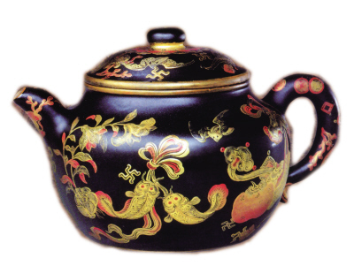 宜兴窑紫砂黑漆描金吉庆有余壶 清乾隆