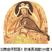 约在南北朝时,“曲项琵琶”通过波斯传入中原地区。此乐器,四弦四柱、横抱、用拨子弹奏。