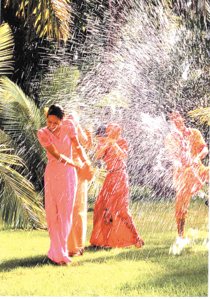 到了节日,傣族男女老少就穿上节日盛装,挑着清水,先到佛寺浴佛,然后就开始互相泼水,你泼我,我泼你,一朵朵水花在空中盛开,它象征着吉祥、幸福、健康,青年手里明亮晶莹的水珠,还象征着甜蜜的爱情。大家互相泼啊泼,到处是水的洗礼、水的祝福、水的欢歌。朵朵水花串串笑,泼水节成了欢乐的海洋。