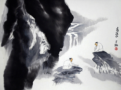 无论是“志在高山”,还是“志在流水”,伯牙在曲中每表现某一主题或意象时,钟子期必能领会其意。一日,伯牙与钟子期共游于泰山之阴,逢暴雨,二人止步于岩下。伯牙心情郁闷,于是弹奏了一会琴。琴曲起初表现的是雨落山涧的情景,接着模拟山流暴涨和岩土崩塌之音。每段曲弹奏完毕,钟子期“辄穷其趣”,把曲中意象说的穷极通透。伯牙于是离开琴而叹道:“善哉,善哉,阁下能听出曲中志趣,君所思即是我所思啊,我哪里能隐藏的了我的音声呢?”于是二人成为人生知己。但《列子》中并无伯牙因钟子期离世而从此不再鼓琴的内容。