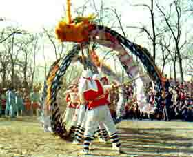 春节的民众活动中,至今仍保留着一些开始于宋代和清代的民间歌舞形式。自古华夏民族以龙为图腾,在漫长岁月中龙逐渐已被人们所神化,被当作既可腾云驾雾、又能翻江倒海,主宰农田旱涝的神灵,而被以农耕为生的汉民族所尊崇、祭拜。因此,在从南到北的汉族地区便出现了春节时,被人们舞耍于硝烟弥漫、震耳欲聋爆竹声中,千姿百态、无以数计的各种龙形。其中最被人们熟悉的要算是形体硕大、长达10米左右,用彩绸扎起来的“布龙”或“彩龙”。《龙舞》,是在数名男子高举支撑龙体的木柄,在穿梭奔跑之中表演“龙打滚”、“龙摆尾”、“金龙缠玉柱”等极有气魄的造型舞蹈