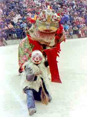 ;将制作精美的小龙缚于长凳之上,由三名男子各举一凳腿,奔跑跳跃、翻转作舞于喧天锣鼓之下的《板凳龙》,是黄河以南省份被人喜爱的龙舞形式。此外,把龙体分为若干“段”或“节”的《段龙》、《五节龙》;由一人独自戏耍,留存于苏杭和川北,小巧的“苍龙”、“纸龙”;还有为人鲜知,延续于浙江沿海渔村,几乎没有龙形而呈船状的“首饰龙”、“十八档龙”等等,真是异彩纷呈、数不胜数。春节期间,这些飞舞在汉族广大地区品种各异、形态离奇的龙形,充分显示着龙的传人悠久的历史与浩瀚的文化。汉族《狮子舞》自汉代由西域传入的假形舞蹈。随着佛教文化的流传,新春之际在霹雳炸响的爆竹声中“舞狮”,逐渐成为人们避邪免灾、吉祥纳福不可或缺的形式。形态可掬、温文尔雅,以表演戏球、踩踏板,与人亲昵似猫的“文狮”和矫健迅猛、虎视眈眈,以高难杂技性表演为主的“武狮”,基本成为北、南两方风格廻异的两种“狮舞”形式。“狮舞”除以上表演形态外,还有至今流传在陕西省城固县的“狮舞”一绝:“笑和尚耍狮”。