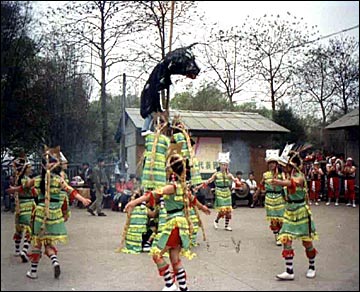 这时,众猫咪开始表演起模拟人们丰收后进行最后一道工序 — 收粮入仓的舞蹈。就在为获得丰收而充满欢欣进行舞蹈的同时,一只头顶尖嘴“鼠头”身披灰色“鼠皮”的大老鼠精,以四处窥视、鬼头鬼脑、悄手悄脚的夸张舞姿进入屯粮的场院后,看到座座粮仓放置于静寂的场院内无人看管,便手舞足蹈乐不可支地准备立即开始破仓盗粮。就在大鼠精得意忘形时,隐蔽在一旁的大猫神伴着一声大吼蹿了出来。本企图负隅顽抗的大鼠精,一看来势凶猛的硕大猫神,求饶不成便立刻仓皇逃窜,企图能逃出天敌猫神的利爪,求得活命 [图3]。在场外越发激烈的锣鼓声中,一场决定生与死的猫鼠大战把《火猫舞》的气氛推向了最高潮。终于在场内众猫咪的狂舞和场外观者的齐声呐喊,在喧天锣鼓和喇叭的鸣响和大猫神威风凛凛一鼓作气追穷寇的奋力下,凶神恶煞的老鼠精终于被按在了大猫神的利爪之下。令人倍感亲切和充满美好希望的《火猫舞》,最后结束在人们的尽情欢呼,众猫咪的跳跃旋舞,以感谢猫神为民消灭鼠精,庆贺丰收成果不再被掠夺的高潮中。