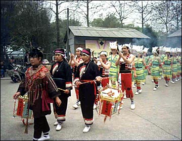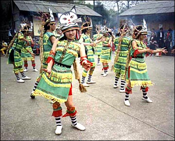 届时,扮演众“猫咪”的20来个青年男女,身着颜色鲜艳、饰有层层流苏似花猫毛皮的衣裙,头戴用稻草扎成的头箍和延长下来、垂于身后,形如猫尾的长稻草辫子,并在“从头到尾”的稻草辫子上,插上根根“燃香”,每人的前额上方再缚上一张事先绘制好的面具“大猫头”。