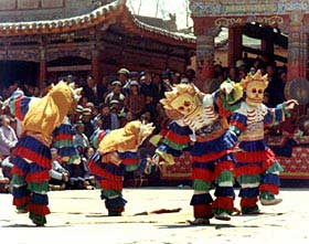 紧接下来的是,一组组具有专题宗教内容的神祇舞蹈,如突出显示神灵无上威力的“法神舞”、“凶神舞”、“金刚神舞”,表现地狱中小精灵们相互玩耍、嬉戏的“骷髅舞”,为人间带来福禄的“鹿神舞”,宣扬乐善好施、长命富贵的“寿星舞”、“仙鹤舞”,以及表演佛经中“舍身饲虎”、“因果报应”等佛经故事的舞段,令人目不暇接。