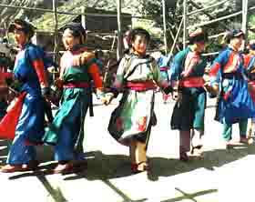 服装艳丽、精神焕发的姑娘们在《女子锅庄》开场前,首先要接受村寨中德高望重老人们的诵经、祝福和按照礼仪饮一巡咂酒,然后才开始跳舞。