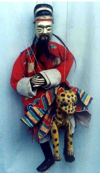 中国历史上,称药王的人有好几位:汉代的华陀,明代的李时珍,春秋战国时代宋国的扁鹊。可是,四川傩坛中所指的药王是生于隋朝、主要生活于唐朝的济世名医孙思邈。传说,唐王李世民在一次战争中,打了胜仗,命随军厨子办“九斗碗”(旧时四川农村中最丰盛的宴席)奖赏有功将士。不料,众将士暴吃一顿后,个个拉稀,直跑茅房,这下急坏了唐王。赶紧张榜招医,悬赏治病。这事被孙思邈知道了,立刻来到唐营。他了解了病因,查看了病人舌苔、脉搏后说:“这是因中暑受热,暴饮暴食所致。”接着开了药方,命人到山上采了不少草药,熬水吞服。真是神了,大家吃药后当天止泻。高兴得唐王连喊:“真是神医,药到病除呀。”即命中军,重金答谢。可孙思邈分文不取,悄然离去。后来,唐王的妃子生了重病,茶不思饭不吃,成天恶心欲吐。御医也曾相看,不见病情好转,唐王立即派人请孙思邈看病。孙思邈给唐王贵妃把脉,察看舌苔、神色后,向唐王双手一拱,笑道:“恭喜唐王,贺喜唐王。”唐王惊诧:“喜从何来?”孙思邈说:“贵妃有喜了。不过目前体虚脉弱,需要食补调理,定然早生贵子,添福添寿。”唐王一听,喜出望外,连连称谢,并亲口封赠孙思邈为药王。以后,孙思邈为药王的称呼,也就广为传开。