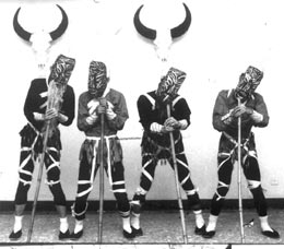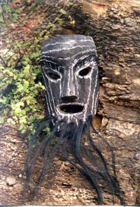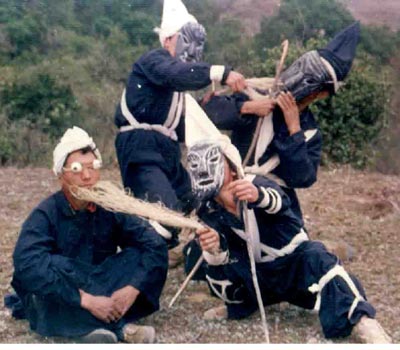2 正戏。正戏就只有一个剧目——“变人戏”。它的内容是反映先民创业、生产、繁衍、迁徙的历史,反映的是“人类刚刚变成的时代”。描述先民如何烧山林、开土地、刀耕火种、驯牛耕地,然后获得丰收。演出中,对先民如何驯牛、犁地、撒种、薅刨、收割、脱粒、翻晒、贮藏等生产过程,都作了粗犷的示意性动作描述。劳作休息时,还有交媾、喂奶等 场面。演出由模拟动作、原始舞蹈及用彝语讲述的对白和诵词组成。诵词内容主要是驱邪、讲史、祝福。演出中,除惹嘎阿布用常人声调讲彝语外,其他几个“撮泰”老人,则用抽气冲击声带发出怪声答话,很像猿猴一类动物叫声。面具大于真面,有猴相,前额宽大厚实向前突出。制作工艺原始、拙朴、粗犷。有打击乐器锣、鼓、钹,但只是在演出开始和舞狮时敲打。