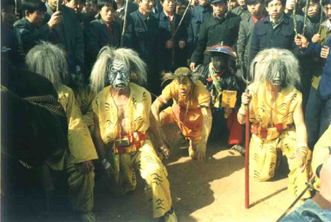 这个戏的演出时间长达五、六个小时,演出的场地主要在村里几条较宽的街道上和村外河滩上。演出空间是流动的,而非固定在一个地方。从戏的内容考察,属于傩戏范畴,但当地人称之为“队戏”。据考证,宋代盛行队舞,在队列行进中表演各种舞蹈,后演变为有故事情节的队戏。一般都是在行进中演出,不断地变换演出空间。表演形式属于流动性的哑剧。