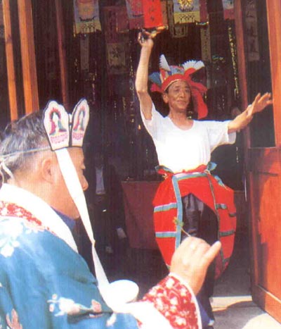南通的巫师叫童子,这可是唐王李世民册封的。大唐贞观年间,江淮有五个举子进京赴考,误了考期又无回家的银两。他们凭就吹拉弹唱的本领,在长安城说唱乡曲童子书谋生。唐王宣五位举人金殿 献艺,晨昏相伴。一天,龙虎山张天师进宫。唐王想试试天师的本事,让五举人躲在金殿下的地坑中,上用木板掩盖,约定跺脚为号,指挥乐声起止。天师上了金殿,只闻音乐飘忽隐显,不见人踪。唐王戏说天师携妖魔入宫。天师祭剑屈斩五位举人。五举人化成冤魂大闹皇宫,向唐王索命。唐王无奈,请天宫三仙女领弟子用巫法仪式平息了纷