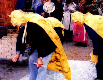 然后,由神匠和帮军击单面皮鼓对虎神唱〔恭迎歌〕,把虎神迎进院内,接着神匠前引,唱〔点五方〕、〔走五门〕神歌,众虎神则随唱词在红布上翻滚起舞。歌舞毕,神匠引虎至家堂门前,击鼓唱〔拦门歌〕,虎神通过唱词得知门神不让进宅,则咆哮起来,众小虎发怒后则纵身由窗户跃进屋内,大虎也接着三跨门槛,最后夺门而入,这段称谓“虎神入堂”。
