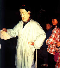 南丰大傩班的和合舞也不同。上甘村《福禄寿》中的和合二仙由成人装扮,挽颈搂腰舞蹈,与福禄寿三星相会后下界,赐福人间合家团聚,儿孙满堂。田东村《和合》,由青少年表演,面具都有双髻,各穿月白色长衫。和仙右手拿折扇,左手握官页;合仙右手执云帚,左手拿算盘。云帚与扇子,体现仙人的潇洒风度。官页即官方颁布的历日,唐代每当岁暮,朝廷要给大臣赠送钟馗画像和新历日,表示驱除群厉,迎候新春。官页与算盘,寓意除旧布新,福禄相连。罗家堡傩有军傩特点,《和合》面具无双髻。小孩扮和仙,黄衣红裤,拿官页;青年扮合仙,黄衣红裤加戏装靠腿,拿算盘。体现兄弟和睦,文武双全。