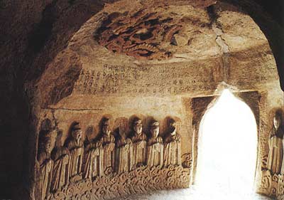 石窟渊源编辑本段回目录山西是南宋、金、元之际归蒙古族统治较早的地区之一,也是道教的一支全真道早期得到较大发展的地区之一。龙山石窟造像题材,除少数道教普遍敬奉的三清尊神外,大多是该支派尊为开山祖师的造像。在丘处机住持的长春宫(今北京白云观前身)等元代造像久已不存的今天,龙山石窟相当完整地保存着具有全真道特色的雕刻品,是很可宝贵的。