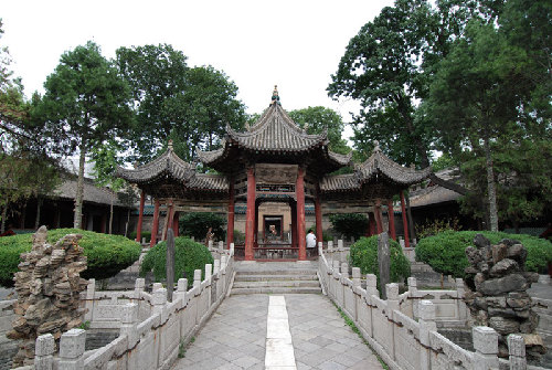 一真亭南北各有碑亭一座。进石门,走上广阔的大 月台,大殿就在正端。大殿面阔七间,进深九间,面积约一千三百平方米,可容纳千余人同时作礼拜。殿内天棚藻井,有画六百作幅,彩画图案不一,每幅中心有阿 拉伯文“嘟哇”,墙壁刻蔓草花纹,套刻古兰经,构图着色,均表现中国伊斯兰教寺院建筑和宗教彩画的特色。