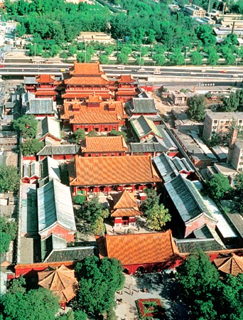 侧看雍和宫万福阁藏传佛寺的艺术特点:清代藏传佛教建筑艺术与传统佛寺有许多不同,其表现力更为强烈、神秘。首先是寺院内容扩大,除了一般礼拜的佛殿外,有专门供全寺僧人念经的大经堂。因藏传佛寺内喇嘛众多,故经堂面积皆十分巨大。此外,寺院内还有喇嘛公署、僧舍、仓库、供养塔、转经廊等,集宗教活动、供养偶像、学习、生活、行政办公等各方面内容于寺院内。其二,寺庙选址结合山势者甚多,加之任何寺庙都有不断扩建的过程,因此其布局多采用自由组合式,错落交搭,不强调轴线关系。其三,主体建筑群皆甚庞大,而且以其多变的形象去反映宗教构思,如曼荼罗、佛国世界、须弥山、大宫,皆是经常运用的意匠,因此在空间象征艺术上具有十分突出的成就。其四,大空间、大体量的殿堂建筑促进了建筑结构形式的创造。这时期的贴金柱、包镶柱,以及无斗拱的多层梁柱框架体系都是木构技术的新创作,并形成了一大批著名的巨构,如普宁寺大乘阁、安远庙普渡殿、雍和宫万福阁等。其五,与元代喇嘛塔相对比,清代的塔型发展了一步。如北京北海白塔、西黄寺清净化城塔、呼和浩特席力图召喇嘛塔,以及西藏桑鸢寺四座喇嘛塔、承德普宁寺四座喇嘛塔等,皆各具特色。有的还组合成五塔、八塔,以及塔门等。其六,藏传佛教在佛像雕刻塑造方面,多为神态恐怖的番像。同时殿堂内部应用了柱衣、幡幔、壁画、唐卡、酥油花等作为装饰,因此内部景观更为神秘,不可捉摸。