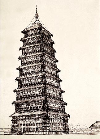 北朝佛寺宫殿化最典型的例子是公元500年左右建的洛阳景明寺和公元516年建的永宁寺。景明寺有七层塔,永宁寺有九层木塔,是北魏皇家在洛阳所建最大的寺院。史载永宁寺平面矩形,四面开门,南门三层,高20丈,形制似魏宫端门,东西门形式与南门极近,但高只二层。寺内中间有方14丈的台基,上建九层木塔。塔面阔九间,各开三门六窗,门皆朱漆金钉,塔各层四角悬铃,是此期间北魏所建最高大豪华的木塔。塔北建有大佛殿,形式似魏宫正殿太极殿,殿内供奉高一丈八尺的金佛。此外,寺中还建有僧房楼观一千余间。从该寺设南门似魏宫端门、建佛殿如太极殿看,它是典型的宫殿化寺庙。