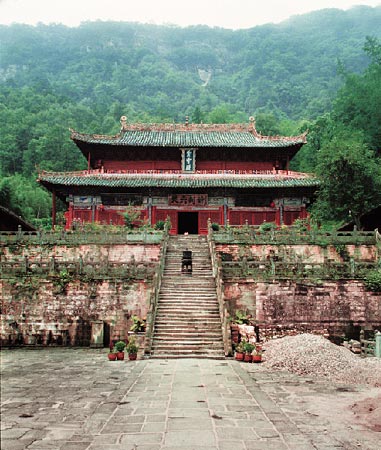 武当山在湖北均县(今丹江口市)境内,是道教“七十二福地”之一。据道书称,真武大帝在此修炼成功“飞升”,所以历来就是道教的名山胜地。唐代,山中开始建造道教祠宇。明初,明成祖朱棣声称,他起兵南下夺取政权因有北方之神真武大帝阴助而取得成功,为了报答神佑,在武当山大兴土木,建造道教宫观。永乐十年(1412年)从南京派遣工部侍郎等官员率领军工民匠二十余万人,历时十一年,建成了八宫、二观、三十六庵等建筑群。其中“宫”的等级最高,规模最大,“观”次之,“庵”又次之。这一大批建筑都沿着溪流峡谷自下而上展开布置,从均县城内开始,到天柱峰最高点,一路都有宫、观、庵、庙,形成长约60公里的参拜路线,最后到达真武大帝所居的金顶“紫禁城”。工程完成后,明成祖赐名“大岳太和山”,选道士二百人供洒扫,道士九人为提点官,主管山上各处祀事,又赐田277顷以资赡养。