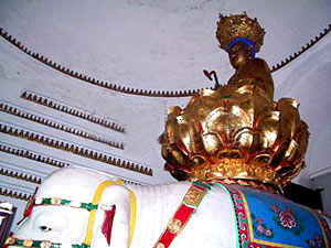 寺内还有高2.4米的永乐瓷佛,是明永乐年间江西景德镇烧制的瓷佛像,佛身上有许多小龙,每个小龙中都放有一个小金佛,各具神态。寺门正对的小山上有一铸于明代的莲花铜钟,“峨嵋十景”之一的“圣积晚钟”即指此钟。此钟高2.8米,直径2.4米,重量达到12500公斤,号称“天府钟王”。钟身铸有61600字,有《阿含经》及其他佛偈、铭、疏和晋唐以来历代帝王和高僧的名讳。1