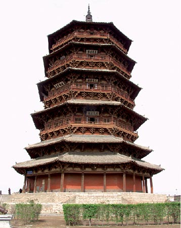 建于辽清宁二年(1056年),塔高67.31米,平面为八边形,底层每边长5.58米,外观为五层,内部还有四个暗层,共九层。木塔中间为大厅,四周为回廊。柱子按内外两环布置,由于暗层柱间采用近似桁架的作法,外立面有四个面的柱间,当年也曾设有斜撑,形成双套筒式结构。四个暗层形成四个刚性较大的环,犹如现代建筑中的圈梁。这样大大加强了结构的整体性,以致历经多次地震而无恙。木塔造形匀称而稳重,各层平面逐层向内收缩,层高逐级减少,随之将各层斗拱作法和屋檐的长度进行调整,不但创造了优美的总体轮廓,产生高耸向上的艺术效果,而且通过那一层层的屋檐和平座,有节奏而又有变化的出现,产生了优美的韵律感,是结构与艺术造型有机结合的典范。