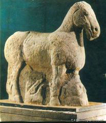 霍去病墓前跃马和卧马石刻也是一种纪念碑式的雕刻,前者后腿曲蹲,前腿抬起,体态强健,作昂首奋力腾跃之势。后者作憩息之态,但却昂首警惕,有随时纵身跃起的神态。这两件作品均神态昂扬,既表现了战争环境的紧张气氛,也表现了一种勇猛无敌的气概。尤其是后者,更是这组石雕群中“马踏匈奴”之外一件独具匠心的珍品。卧马石雕高114厘米,长260厘米,为圆雕作品。作者以敏锐的观察力个精湛的技艺,紧紧抓住马好动的特性,不能长时间卧在地上。这匹马虽然在静卧憩息,但显出即将起身的形态,即由静到动的过程。所以头部微仰,一只前腿向前伸出,蹄用力着地;另一只腿微曲抬起,都反映出这匹马将起未起的动作过程。作者仔细观察这一动态过程,然后又智慧地、细心而又大胆地雕琢出这一具有深意的题材。尽管这批卧马形象拙朴,但却蕴有一般马所具有的活力。这种特点与现存汉马形象的实物,包括汉画像石刻上所见的形象迥然不同。
