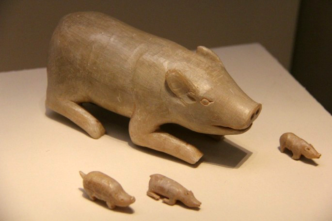 1956年湖南长沙南门外出土,大者长18.3厘米,小者分别长4.9厘米、4.3厘米、3.7厘米。汉代已普遍饲养猪,以圈养为主,一些地方官吏“劝民农桑”。要求每户养2头母猪、5只鸡,或者1头猪、4只母鸡。汉代丧俗中,往往在死者手中各握1件石猪。西汉的王侯下葬时,不仅要身穿金缕玉衣,手中还要握着玉质的条形“玉豚”,也就是石猪也长沙南门外还出土过东汉绿釉陶猪圈,长沙唐墓中出现过石猪。