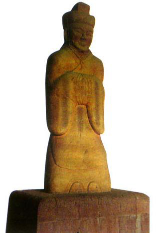 立于墓前的石人一般称为石翁仲,翁仲本是秦始皇的一力士之名,他守卫临洮,威震边陲。他死后,其形象被铸为铜像,置于咸阳宫前,用于震吓匈奴人。后人便将立于宫阙、特别是陵墓前的铜人、石人统称为翁仲。与石兽相比,东汉墓表前石人遗迹较少。现存河南登封中岳庙前的一对石翁仲是我国现存最早的石翁仲雕像,作于东汉安帝元初五年(公元118年),高约1米,用方柱形石材雕成,雕塑手法简练,形象庄重稚拙,具有汉代石人的一般特点。山东曲阜乐安太守麃君墓前的两个石人神态肃穆,手法简练,也有类似特点。山东邹县匡衡墓前的石人,高约120厘米,用砂石雕成,双手叠置胸前,作站立姿态。以上作品都属石翁仲性质。