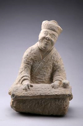 石俑头戴施屋满顶帻,此为东汉比较流行的一种样式。当时贵贱通服,以颜色作为等级的区别。帻内又似包巾。身穿交领长袍。衣领和袖子用丝绸或细布缘边。汉代没有棉花,衣料为绸或麻。庶人只能穿粗纺的麻衣,好一点的衣服则是用丝绸或细布在衣领和袖子缘边,起到装饰作用,称作“纯以缘”。俑衣内衬中禅(即衬在里面穿的无里单衣)。腰无带,席地而坐,乐器置腿上,双手鼓之。圆脸,两眼圆睁,略向上望,面带会心的微笑;其右手抚弦,左手弹拨,整个身体微向左倾,神情专注而又怡然自得的样子,如见高山,如闻流水,心驰神醉,人我俱忘。