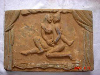 这幅石雕是1942年由著名考古家夏鼐等在四川彭山县崖墓550号墓门第三层门楣上发现,为东汉时期作品。石刻中男女二人跪坐于地,搂抱在一起,做接吻动作,四周无它物,应当是墓主人夫妻生活的表现。对研究当时的艺术、社会风俗有着突出的价值,为国家一级文物,现藏中国国家博物馆。