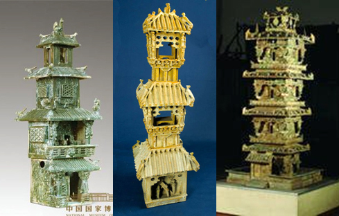 从左至右:安徽涡阳东汉绿釉陶楼;河南淮阳东汉三层陶楼;河北阜城县五层绿釉陶楼