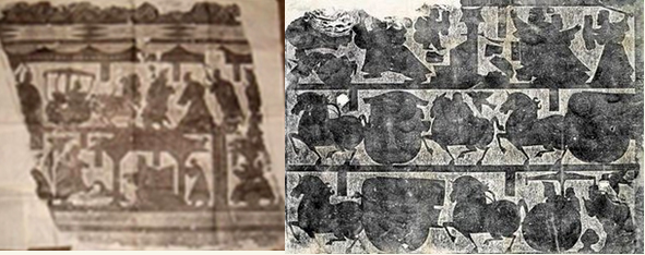 3、沂南画像石:东汉末年大型墓室石刻画像。1954年发现于于山东省沂南县北寨村。墓主姓名无考,从墓室规模和画像内容推测,可能是一兼有大量土地的高级官吏,或为将军。墓分前、中、后三主室,共有画像石42块,画像73幅,分布在墓门和前中后三室的横额、壁面、过梁、柱、藻井、隔墙等处,总面积442平方米。所绘题材广泛,涉及社会经济、政治状况、阶级差别、民族关系、哲学宗教、神话传说、历史故事以及典章制度、衣冠文物、风俗人情等许多方面。依画像的内容和在墓中的位置,大体可归为四组: