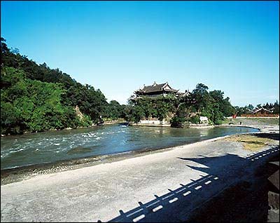 中国四川成都都江堰宝瓶口伏龙观都江堰市,古代蜀国先民聚居地之一。位于四川省中部。既是历史悠久文化古城,也是著名的风景旅游胜地。以城西北处的都江堰工程闻名于世。