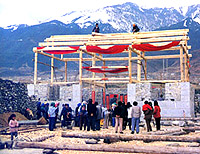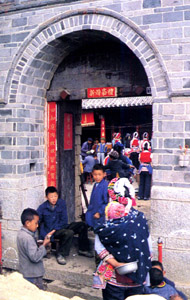 此时的新郎家里已是高朋满座。院子里摆着大大小小二十几张桌子,院子一侧支起临时锅灶,一待新人进门,宴会就要开始。随着一阵高亢的吹奏乐和炮竹声,新人来到门前。这时,新郎的长辈在门前燃起大香,点了一堆火,并向上面洒了些酒。新娘子踏着火进了大门。接着是拜天地,入洞房,坐在床头喝交杯酒。这酒很特别,又甜又辣,不知是放了什么东西,发出一股像辣椒一样的辣味。据说白族人讲辣是亲的意思,越辣也就越亲。于是新娘新郎要喝这种酒,所有来贺喜的人都要喝这种酒。喝了辣酒的我,嘴里不知是什么滋味,心里却感到这习俗中一股古老的韵味,我暗暗祝福这对新人亲亲密密,白头偕老。