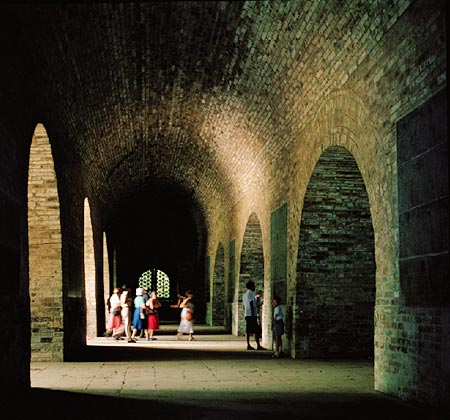 明代佛寺总平面追求完美的轴线对称与深邃的空间层次,如原来的山门演化为前有金刚殿,后有天王殿,成了两进建筑;中轴线上佛殿增至二进或三进,如明南京天界寺有正佛殿、三圣殿、毗卢殿,三殿前后对应;山门内左右对称配置钟楼与鼓楼,佛殿前左右对称配置观音殿和轮藏殿等,都是明代佛寺布局的新特点。砖拱建筑在明代佛教建筑中找到了发展的天地。由于《大藏经》屡次由皇家颁赐,藏经用的防火建筑成了一时的迫切需求,于是用砖拱建造的无梁殿建筑应运而兴。明代无梁殿遗留至今的还有十余处,著名的有南京灵谷寺无梁殿、太原永祚寺无梁殿、峨眉山万年寺无梁殿、五台山显通寺无梁殿、句容宝华山无梁殿、苏州开元寺无梁殿等。