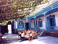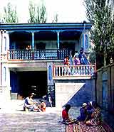 她的话一点不假。好多年以前,伊宁这个中国古丝绸之路上的重镇, 便是一个商贾聚居之地,他们手里有钱,造房子也就讲究。这种习俗沿袭至今。至于房舍的风格,据说是受西亚民居的影响,也有说是受俄罗斯建筑的影响,还有说受伊斯兰教的影响。但基本的格式是有一个开阔的院落,砖木结构的平顶房,房前有一道宽宽的前廊。其门窗雕饰尤为出色。近几年来,伊宁在经济改革中,有些人靠做买卖赚了些钱,于是他们纷纷盖起了新房。其结构、格调依旧,但装修得却更漂亮了。