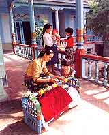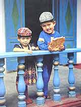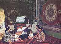 主人自家的居室在这幢房子的另一侧。房间里也有壁毯,但摆设简朴多了。给我印象最深的,是放在被子上的特别大的枕头。枕套是自制的,面上绣着很鲜亮的图案,摆在那里好像是一件手工艺品,很富装饰性。我在几乎所有的维族人家里,无论是在摆满古老家具的房里,还是在时髦的组合家具旁边,都见过这种大枕头,它简直就是房子里的一件装饰。维族妇女手很灵巧,在她们居住的院子里,经常可以看到她们坐在宽敞的廊下绣花,图案各不相同,颜色却都很艳。有时还可以看到她们一边哄着摇床里的婴儿一边做针线。这种小孩的摇床也很独特。床长不过1米,宽只有50厘米,床腿为弧形,可使床来回摇动。许多维族妇女把自己的宝贝放在床上,用带子把孩子的手脚固定好,便一边做活一边用脚踢着摇床,使婴儿很快入睡。每当我看到这种情景时,都会生出一种田园诗般的感觉。