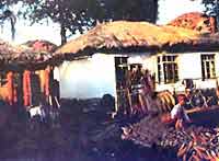 主人陪我们在村子里转了转。村中有些人家的住房是草顶的,屋子比瓦顶的房子矮一些,顶上铺着厚厚的草,墙刷得雪白,室内明亮干净。由于生活水平不断提高,瓦房越来越多,住在草房中的人家有的也在备料,准备在翻修时盖瓦顶了。他们用的瓦很讲究,上面饰有网纹,圆瓦当上还有吉祥文字和较复杂的图案,装饰在大屋顶上美观而有气势。