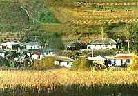 一进入朝鲜族人的村庄,那些富有鲜明民族特色的大屋顶民居就使我们感觉有如到了异域。中国的东北地区因为纬度高,冬天又长又冷,所以房屋的墙壁很厚,远远望去样子都是呆头呆脑的。可是朝鲜族的住房高高大大,好像一条倒扣的鱼船置于房上,四角又高高翘起,犹如仙鹤昂首,显得格外精巧雅致。