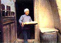 在小院的西北角有一孔窑是粮仓。它与其他窑都不同,因为它的顶上有直通地面的“天窗”。那上面有个打谷场,在收获的季节里,他们在场上晒麦子、豆子。粮食晒干了,就从那道天窗把粮食直接送下粮仓。为了避雨和不使尘土落入仓内,在天窗上盖有小小的遮雨棚。