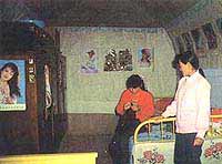 主人姓赵,一家四代九口人。赵的老母亲住一孔窑,赵夫妇带着小儿子住一孔窑,他们的两个女儿住一孔窑,大女儿和女婿带着小外孙住在西边的窑洞里。我走进两个姑娘住的窑洞。那是全院最整洁、最漂亮的一孔窑。窑的四壁和拱顶都抹得很平整,墙壁上糊着白纸,上面粘贴着许多年画;床边靠墙处还挂着白布,显得很素雅。与床相对的另一面墙边摆放着一排组合柜。室内还有她们学习和梳妆打扮用的长桌和椅子,东西不多,整理得让人看了很舒服。两姐妹都已读过初中,现在在家务农。