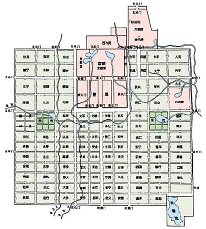 长安平面呈横长矩形,东西宽9721米,南北长8652米,大城称外郭。城内北部正中建内城,东西宽2820米,南北深3336米,面积9.4平方公里,分为南北二部。南部深1844米为皇城,城内集中建中央官署;北部深1492米为宫城,内为皇宫、太子东宫和供应服役部门的掖庭宫。宫城北倚外郭北墙,墙外为内苑和禁苑。外郭中,宫城、皇城以外部分全部建矩形的居住里坊。在皇城以南,与皇城同宽部分东西划分为四行,每行南北划分为九坊,共有三十六坊;在皇城、宫城东西侧各划分为东西三行,每行南北划分为十三坊,共七十八坊;东西各以二坊建东市、西市,实有一百一十坊。各坊或东西同宽,或南北同深,并与皇城、宫城之长和宽相对应。在坊间形成九条南北向街和十二条东西街,另外沿外郭城内四面还各有顺城街,共同组成全城以棋盘状的街道网,其规模程度在中国城市史上是空前的。长安主要城门都有三个门洞,中间是皇帝专用的,左右供臣民出入。相应的,干道上也是中间为御路,两侧是臣民用的上下行道路,两侧植槐为行道树,最外侧为排水明沟。长安官员乘马出行有很大的马队,因此道路都较宽,最宽的是宫城与皇城间的东西街,宽220米,中轴线上主街宽155米,其余主干道宽也在100米以上,坊间的街也宽40米至60米。城内各里坊,在皇城前的四行三十六坊较小,只开东西坊门,坊内有东西横街;在皇城左右各三行共七十四坊较大,四面各开一坊门,形成十字街,分全坊为四区,每区中又有小十字街,再分为四小区,全坊共分十六小区,每小区用三条横巷划分,内建住宅。但大贵族官员不受此限,有的王府、官邸可独占十六分之一坊、四分之一坊、半坊甚至全坊,极为巨大豪华。东西两市各占两坊之地,面积都在一平方公里以上,每面开二门,道路网呈井字形,内开横巷,安排店铺。长安还建有大量寺观,八世纪初时有佛寺九十一座,道观十六座。国家及大贵族建的寺观规划可占半坊或全坊,如慈恩寺、兴善寺。长安有大量西域中亚商人,还为他们建有波斯寺、祆祠和基督教支派景教的寺院。